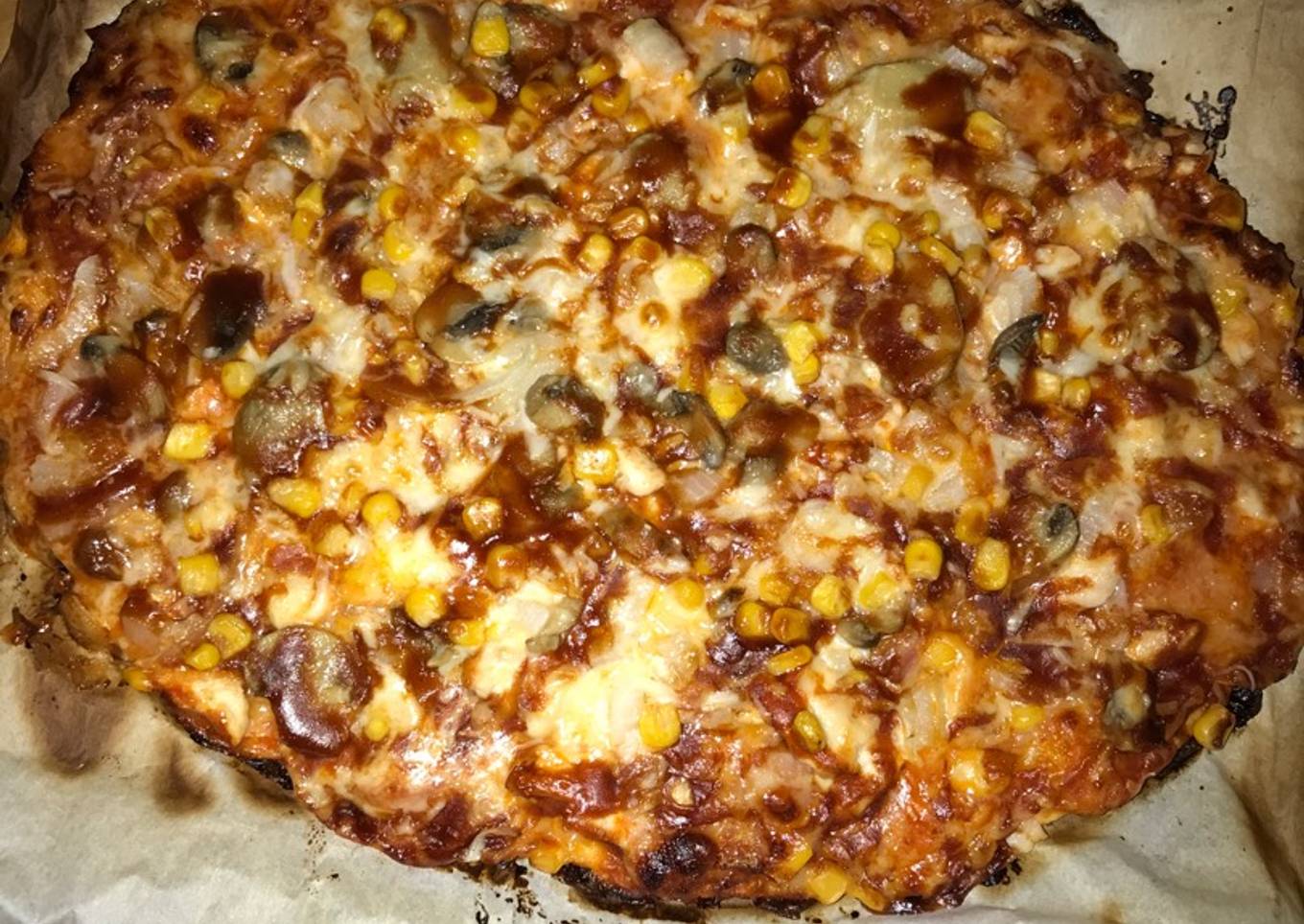 - Luego añadir el champiñón, cebolla y maíz y le ponéis salsa barbacoa en círculos hasta cubrir por todo