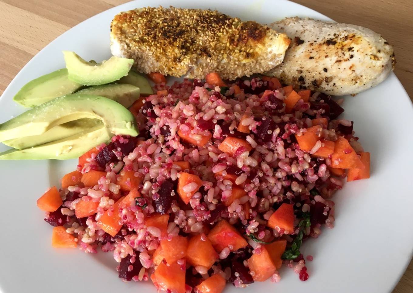 Esta receta es ideal para tupper, porque puedes cocer la quinoa y el arroz integral el día de antes y al día siguiente ya lo tienes listo para mezclar con el resto de ingredientes. Además es un plato super completo con hidratos de absorción lenta con el arroz y la quinoa, vegetales como la zanahoria y la remolacha y cocida que aportan también muchas vitaminas y beta carotenos, grasas saludables con el aguacate y proteínas con el pollo.