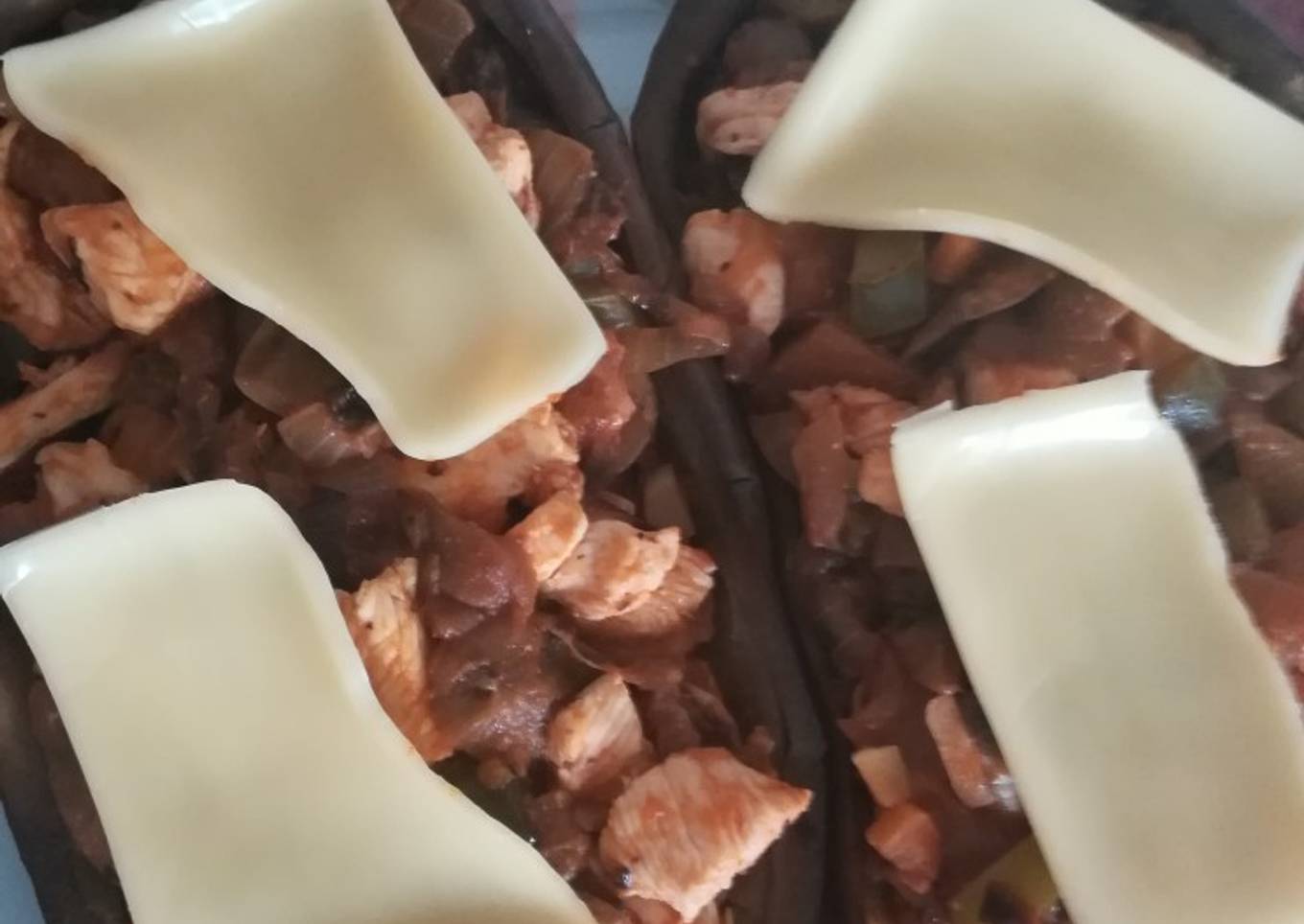 - Rellenamos las berenjenas y ponemos una loncha de queso encima