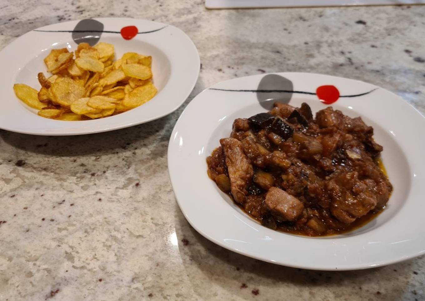 Instructions to make to make Solomillo con berenjenas y patatas chips