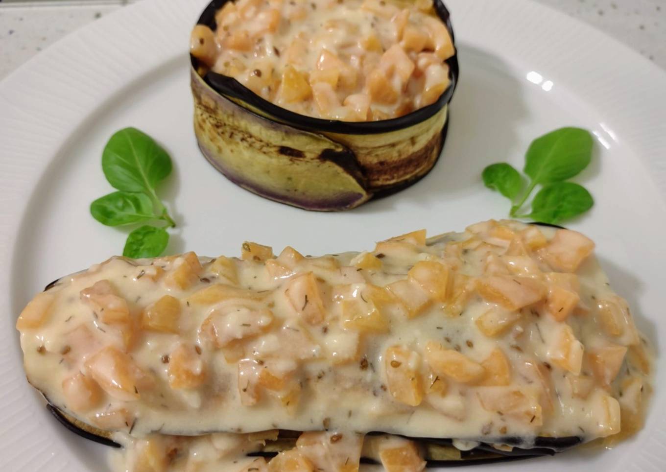 - En un plato colocamos un aro de cocina lo cubrimos por dentro con varias lonchas de berenjenas a la plancha, echamos dentro un poco de batata cocida y por encima rociamos con la crema de albaricoques y listo.